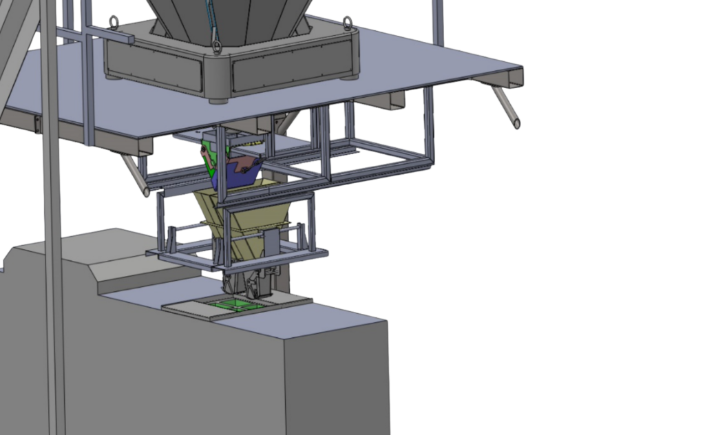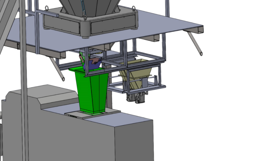 Pod noważarką pracują dwie pionowe maszyny pakujące (VFFS), które niezależnie napełniają torebki gotowym miksem.