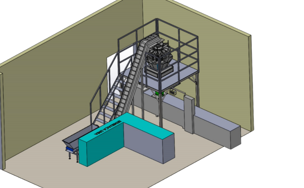 Drugi projekt to złożony, w pełni zautomatyzowany system pakowania łączący dwie noważarki wielogłowicowe pracujące równolegle.